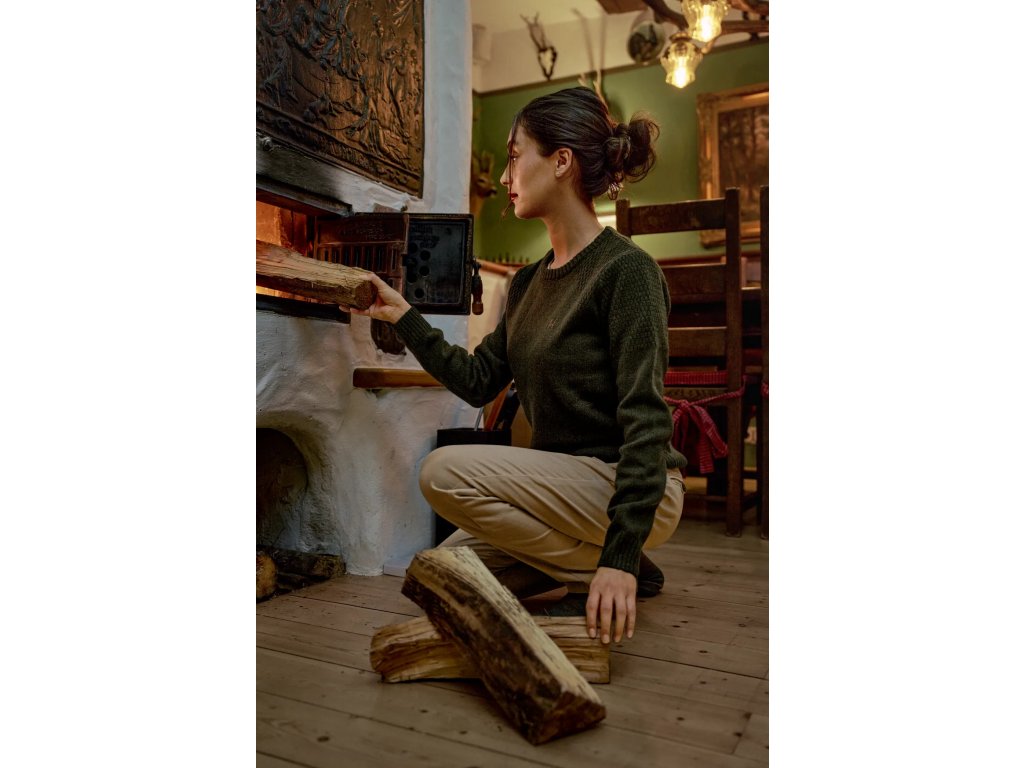Dámsky sveter z merino vlny s termoregulačnými vlastnosťami. S machovým prešívaním na ramenách a podšívkou pri krku z mikrosemišu. Raglánové rukávy a rebrovaný úplet na manžetách a leme. Kombinuje praktickosť s rafinovanou estetikou pre strelkyne.