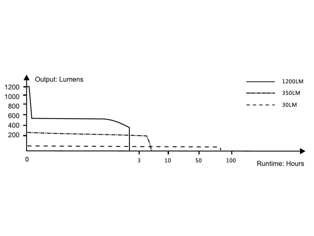 - režimy svietenia: 1200 lúmenov (2,66 hodiny) -> 350 lúmenov (5,3 hodiny) -> 30 lúmenov (82 hodín) -> stroboskop (1200 lúmenov).