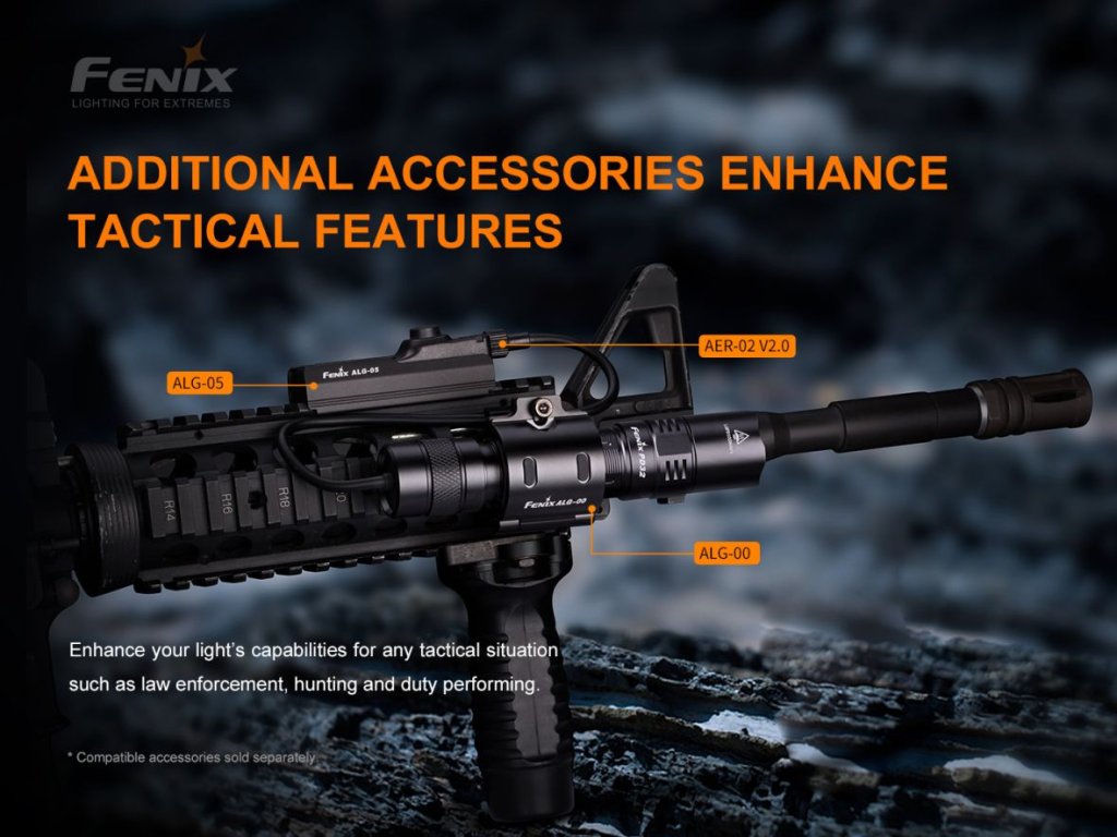 - Ako voliteľné príslušenstvo možno napríklad dokúpiť: káblový spínač AER-02 V2.0, úchyt ALG-05 na diaľkový spínač, červený filter AOF-S+, zelený filter AOF-S+, modrý filter AOF-S+, červený dopravný kužeľ AOT-S, difuzér AOD-S, rychloupínacia montáž na zbraňovú lištu ALG-15, montáž na zbraňovú lištu ALG-00, držiak na bicykel, púzdro ALP-10S, popruh Fenix ALD-05 na použitie svietidla na prilbe, držiak na cyklistickú prilbu BikeBlock, držiak na bicykel Fenix, prípadne kovovú magnetickú montáž na hlaveň alebo plastovú magnetickú montáž na hlaveň.
