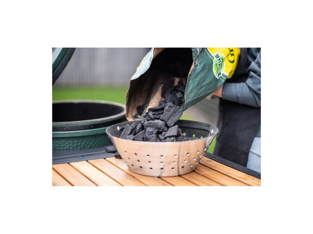 Zároveň je vybavený množstvom otvorov pre zabezpečenie dôkladného horenia, ľahkého preosievania drevného uhlia, ale hlavne rukoväťami pre jednoduché vkladanie a vyberanie z EGG. Môžete ho skrátka umiestniť na liatinový ohniskový rošt alebo priamo položiť na dno keramického ohniska a užívať si zvýšený komfort a čistotu.