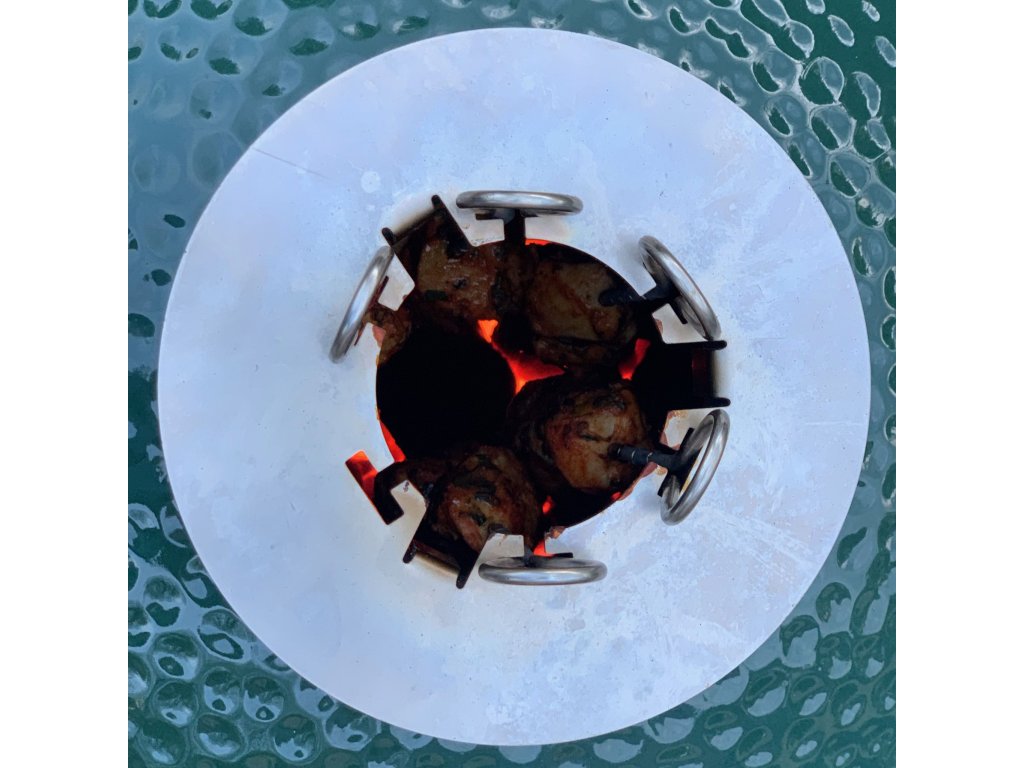Takýto jednoduchý nápad, ale tak efektívny, LetzQ Tandoor Ring premení vaše Big Green Egg na tandoorovú rúru. Stačí odstrániť horný vetrací otvor a umiestniť tandoorový krúžok na jeho miesto, teraz môžete vertikálne zavesiť až šesť špízov do vajíčka a nechať stúpajúci horúci vzduch urobiť všetko varenie. Rovnako ako v tradičnom tandoore, špízy prenášajú teplo na varenie aj zo stredu smerom von. Každý zo špízov je viackrát zvlnený, aby sa zabezpečilo trenie, aby vaše jedlo nespadlo. Stačí ich spustiť cez horný vetrací otvor a zasunúť ich dovnútra.