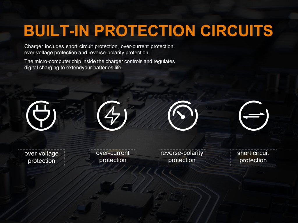 - Ochrana proti opačnému vloženiu batérií, skratu, prebitiu a príliš hlbokému vybitiu.